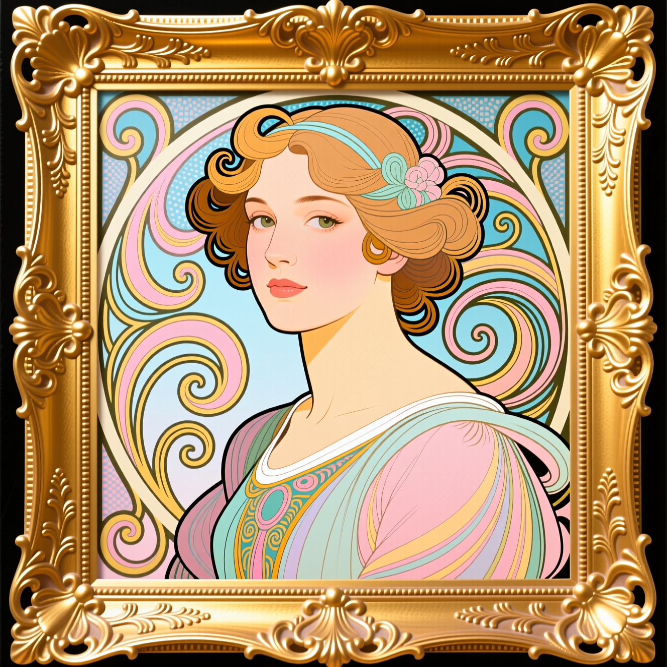 A portrait of a young woman in the style of Art Nouveau, ornate golden frame, flowing lines, pastel colors.