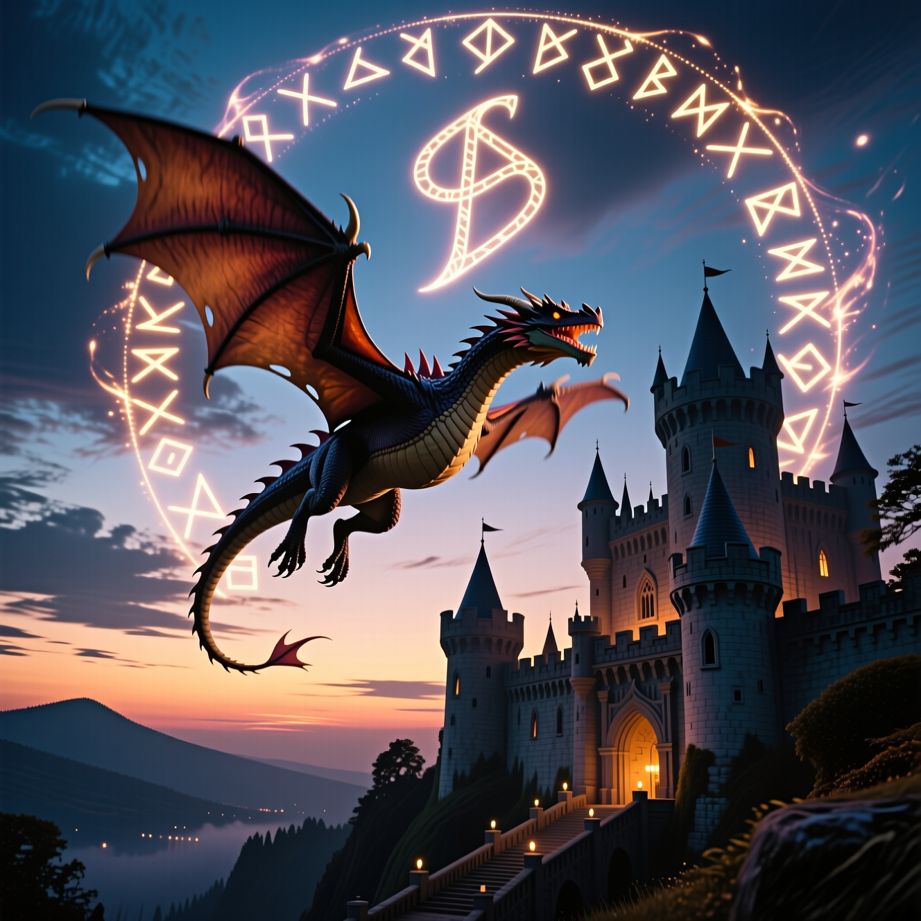 * A dragon flying over a medieval castle at dusk, glowing runes in the sky, magical atmosphere, cinematic wide shot.