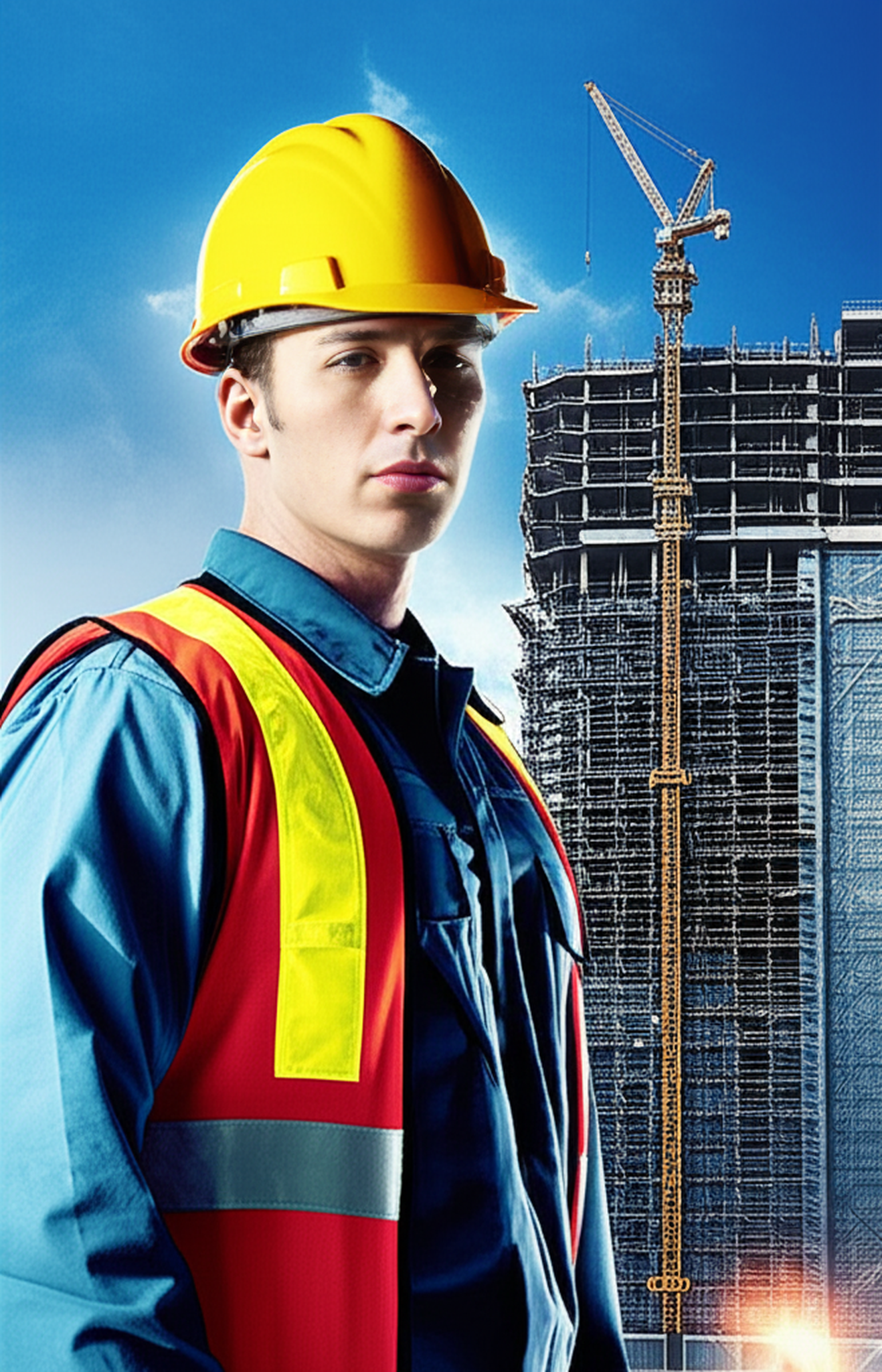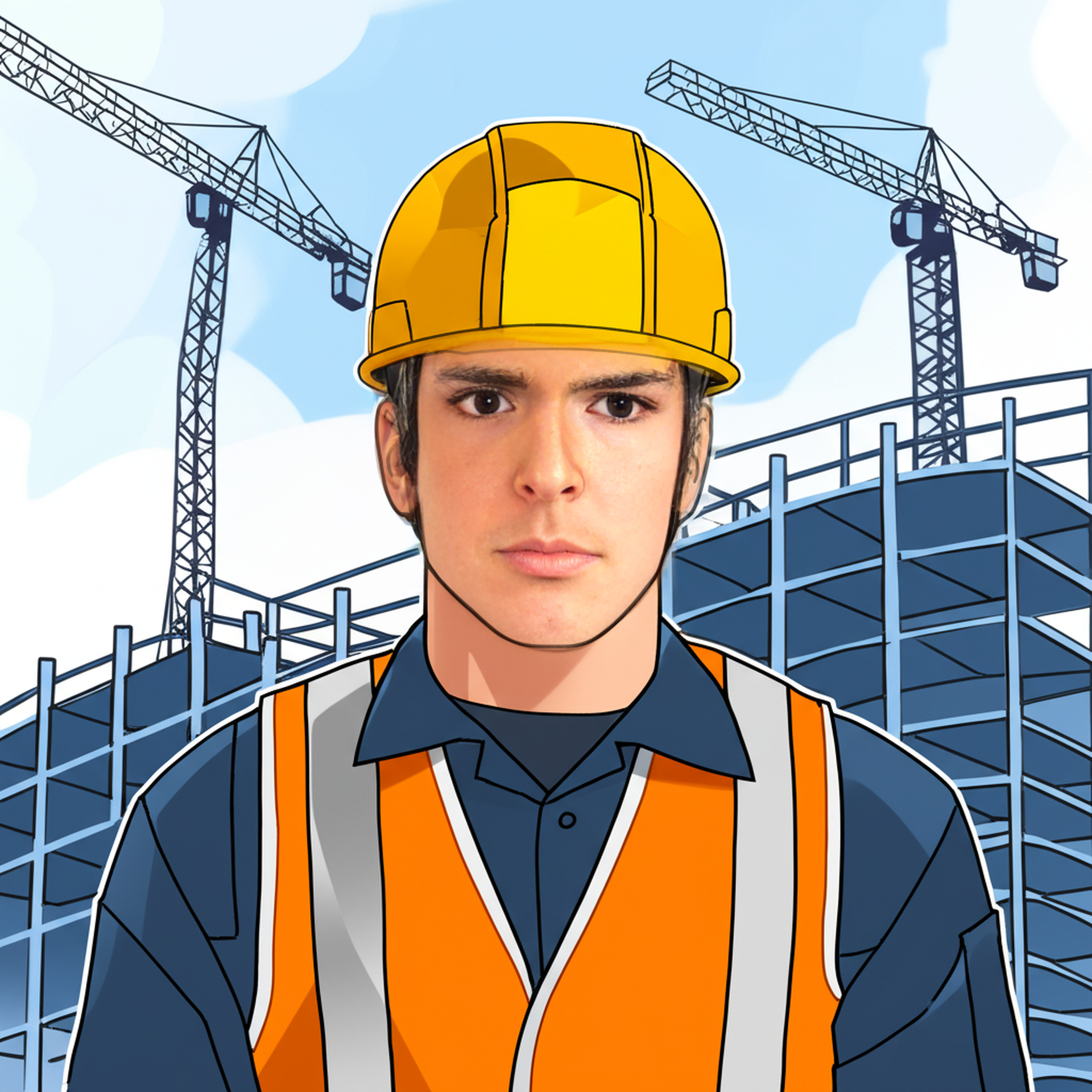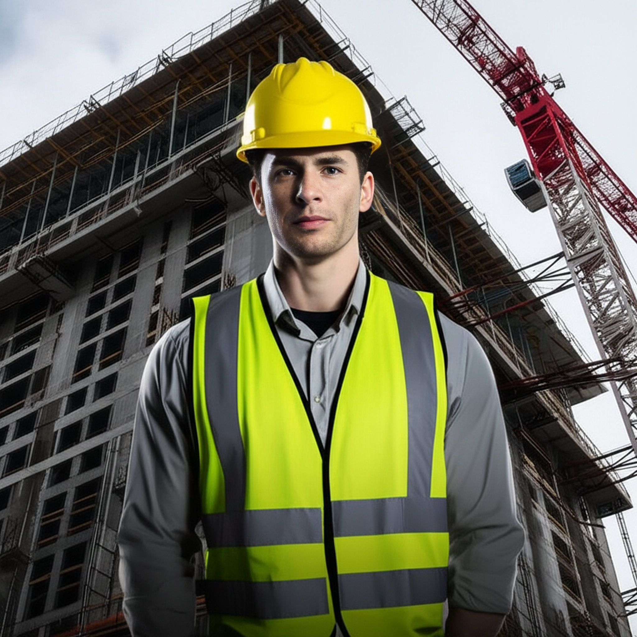 Background: realistic high-rise apartment construction site with scaffolding and cranes.